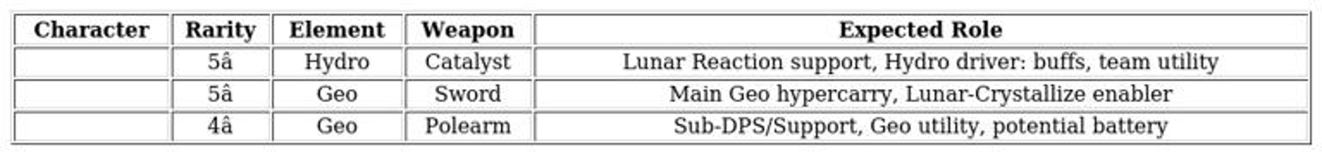 One of the new characters is expected to serve as a hydro applicator and support, crafted for team synergy. Described as a "moon maiden," she may interact with new nod-krai units and could be featured in special events. Her role as a hydro driver might resemble Furina’s output but with distinct buff mechanics.