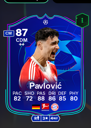 Introducing the formidable Aleksandar Pavlović UCL Primetime card, an 87-rated Central Defensive Midfielder designed to dominate the heart of the pitch. With standout attributes including an 88 in passing, 86 in dribbling, and 85 in defense, this card offers a perfect blend of composure and control. As a deep-lying playmaker and defensive shield, Pavlović excels at breaking up opposition attacks with his strong defensive awareness and physical presence, while his exceptional passing and dribbling skills allow him to initiate swift counter-attacks and dictate the tempo of the game, making him an indispensable asset for any squad looking to solidify their midfield and transition seamlessly from defense to offense.