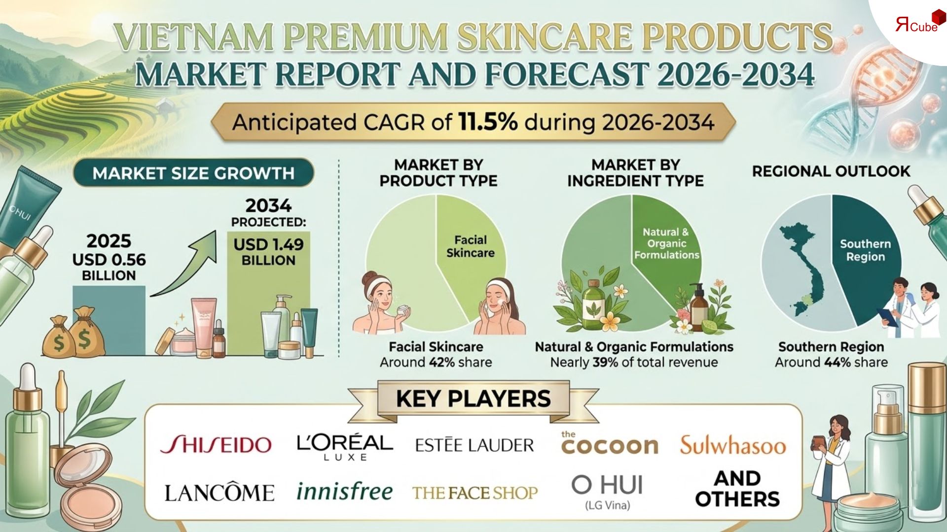 According to recent research report by The Report Cube, the size of Vietnam Premium Skincare Products Market was nearly USD 0.56 Billion in 2025, and by 2034 it is expected to reach around USD 1.49 Billion with a CAGR of 11.5% over the forecast period (2026-2034).