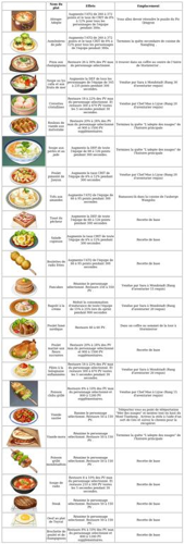 De la soupe au poulet parfumée aux crêpes du Rochenord, chaque recette offre des bonus uniques pour vos personnages.