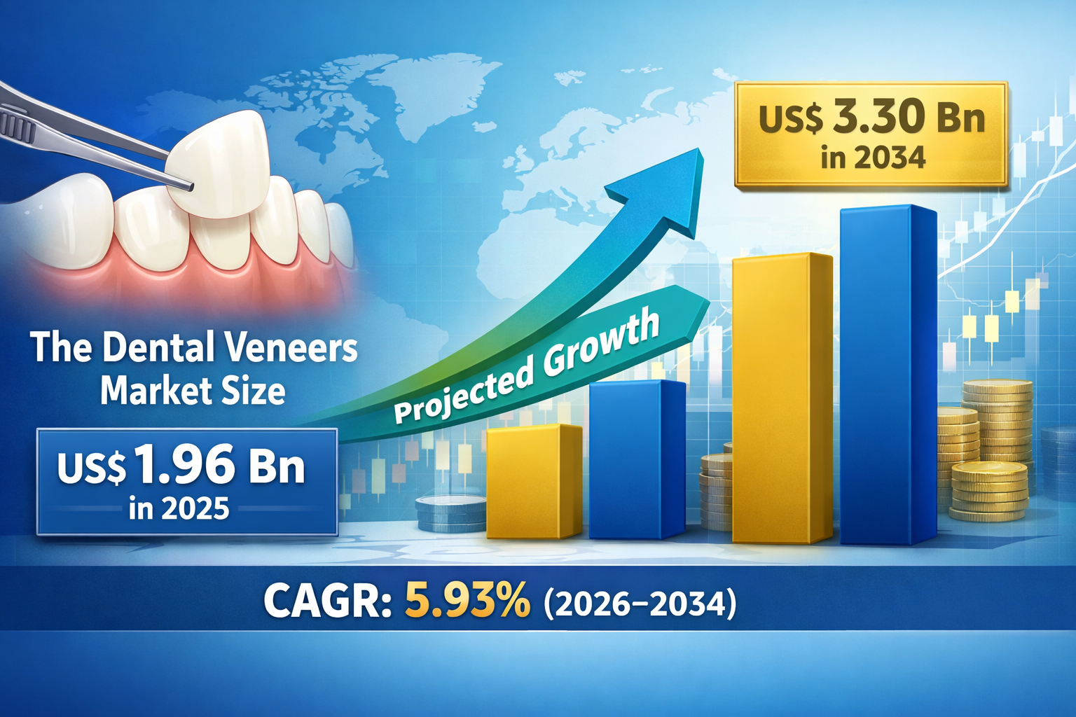 The global dental veneers market is witnessing significant expansion, driven by the increasing demand for cosmetic dentistry and growing awareness about dental aesthetics. Dental veneers, thin shells made of porcelain or composite resin, are widely used to improve the appearance of teeth by correcting discoloration, chips, gaps, and minor misalignments. As consumer preferences shift toward minimally invasive and aesthetically appealing dental procedures, veneers have emerged as a popular solution across both developed and developing regions. The dental veneers market size is expected to reach US$ 3.30 Bn in 2034 from US$ 1.96 Bn in 2025. The market is anticipated to register a CAGR of 5.93% during 2026–2034.